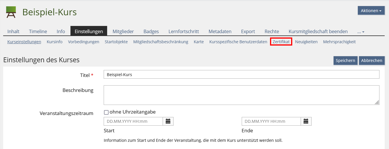 Schritt 1: Klicken Sie in den Einstellungen des ILIAS-Kurses auf den Unterreiter "Zertifikat".