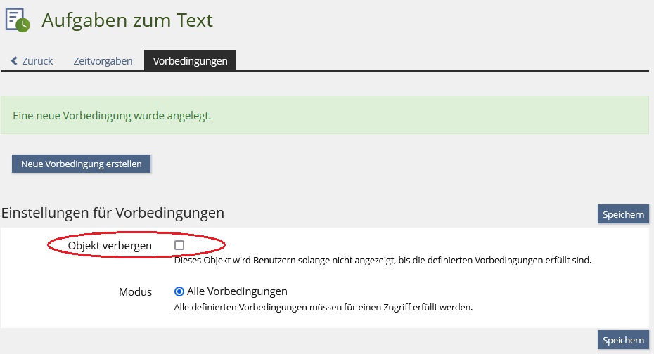 - Verfügbarkeit: Hier können Sie einstellen, ob das Objekt nur zeitlich eingeschränkt verfügbar sein soll - oder ob es Vorbedingungen für das Objekt geben soll (z.B. können Sie die Teilnahme an einem Test an die Vorbedingung knüpfen, dass ein bestimmtes Lernmodul bearbeitet wurde; in diesem Fall lässt sich das Objekt (der Test) nur öffnen, wenn die Vorbedingung erfüllt ist).