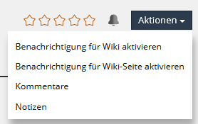 Beim Wiki finden Sie ebenfalls ein Top-Aktionsmenü, über das Sie (und die Studierenden) u.a. eine Benachrichtigung für das Wiki oder einzelne Wiki-Seiten aktivieren können. Das ist insbesondere hilfreich, wenn Gruppen gemeinsam an einem Wiki arbeiten. Über die Möglichkeit, Benachrichtigungen bei Bearbeitungen des Wikis oder der Wiki-Seite, an der die Gruppe arbeitet, zu erhalten, wird die Gruppenarbeit unterstützt und beschleunigt.