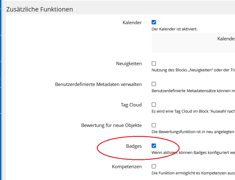 Schritt 1: Badges aktivieren - setzen Sie in den Einstellungen Ihres ILIAS-Kurses im Bereich "Zusätzliche Funktionen " das Häkchen bei "Badges"