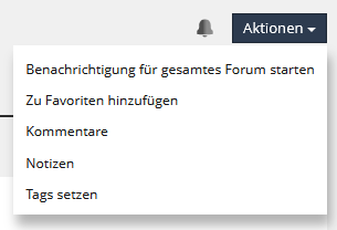 - Benachrichtigung für gesamtes Forum starten: Wenn Sie auf diese Aktion klicken, erhalten Sie über Ihre Nachrichtenzentral, den Neuigkeiten-Bereich auf Ihrem Dashboard und per Mail eine Benachrichtigung über neue Beiträge im Forum. Ob Sie diese Benachrichtigungsfunktion aktiviert haben, erkennen Sie über die orangefarbene Einfärbung des Glocken-Icons links neben dem Top-Aktionsmenü.