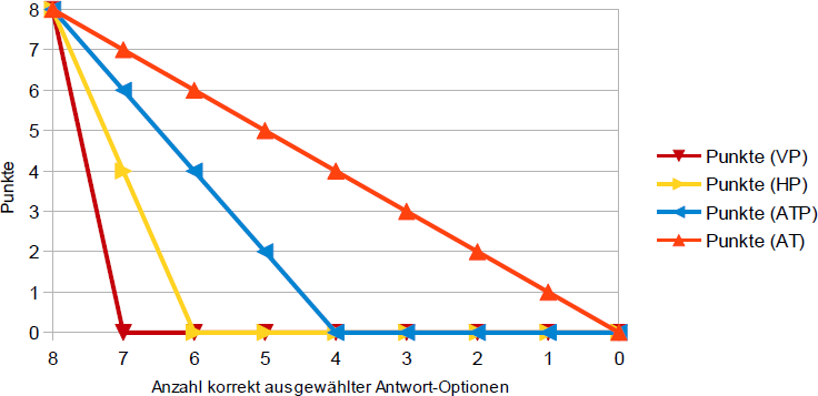 Für jede korrekt ausgewählte (bzw. nicht ausgewählte) Antwort-Option werden gleichmäßig Teilpunkte der Gesamtpunktzahl vergeben. Bei falsch ausgewählten (bzw. nicht ausgewählten) Antwort-Optionen werden die Teilpunkte abgezogen.