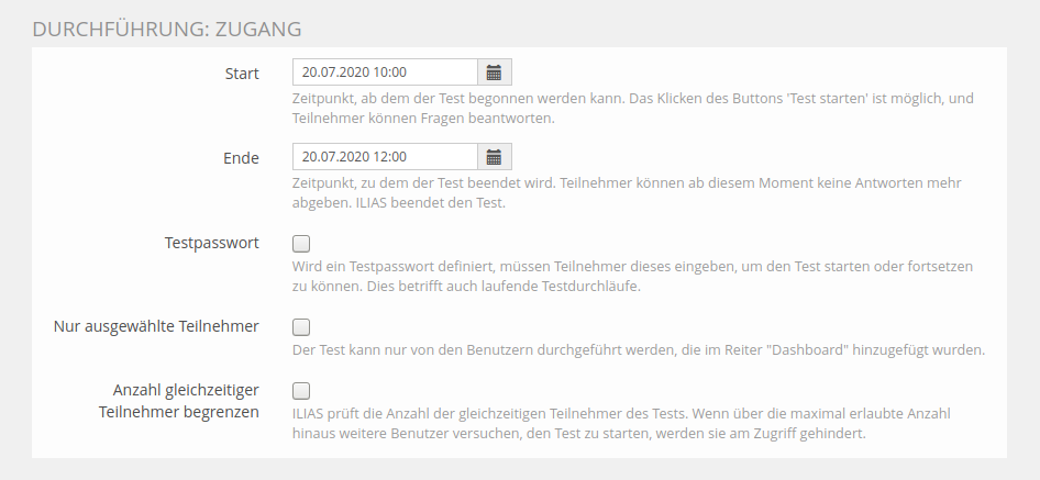 Zugang: legt fest, in welchem Zeitraum der Test gestartet und bearbeitet werden darf.