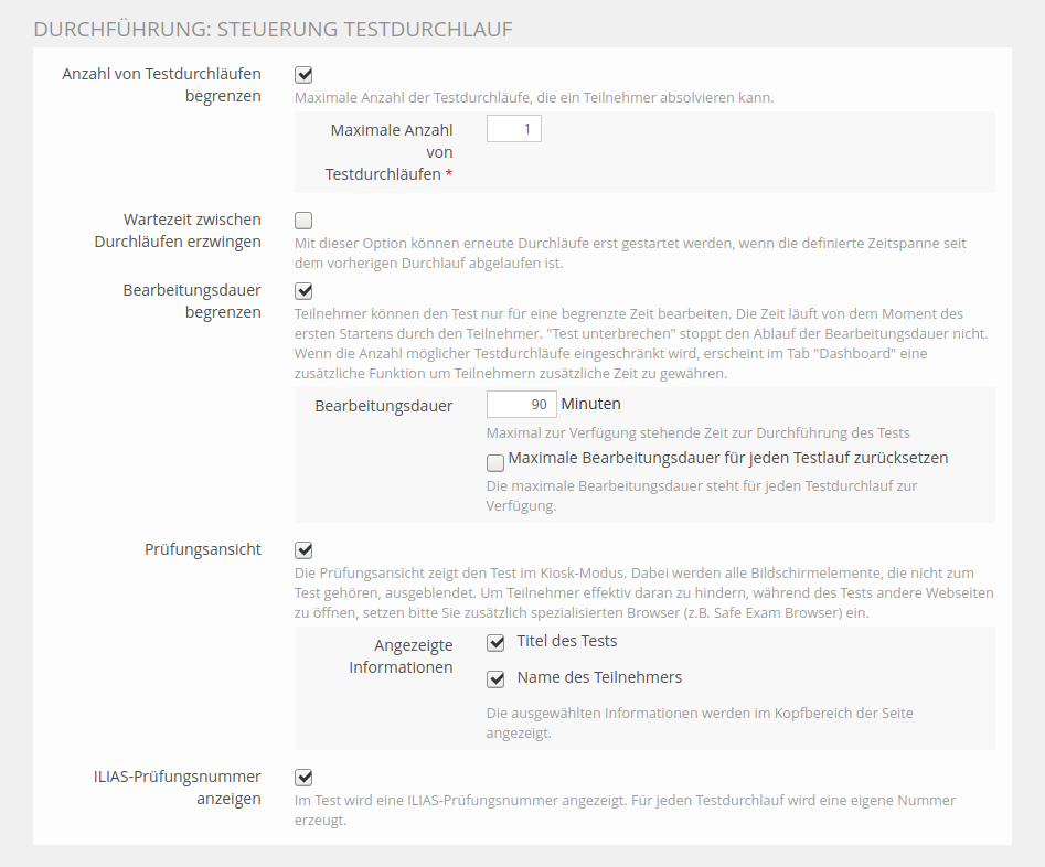Bearbeitungsdauer: legt fest, wie lange der Test bearbeitet werden darf.