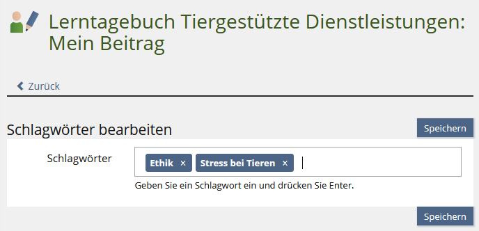ILIAS öffnet eine neue Seite. Benutzen Sie hier die +/– Icons um Schlagwörter hinzuzufügen und zu entfernen.