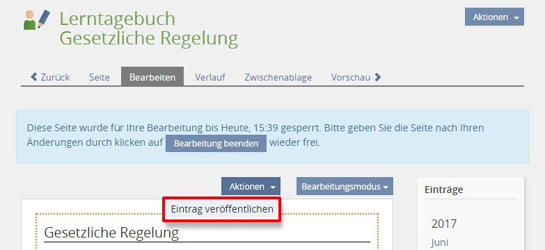 Dies ist Ihr Tagebucheintrag für den jeweiligen Tag. Der Titel sollte den Inhalt des Lerngegenstands darstellen, z.B. "Gesetzliche Regelung".