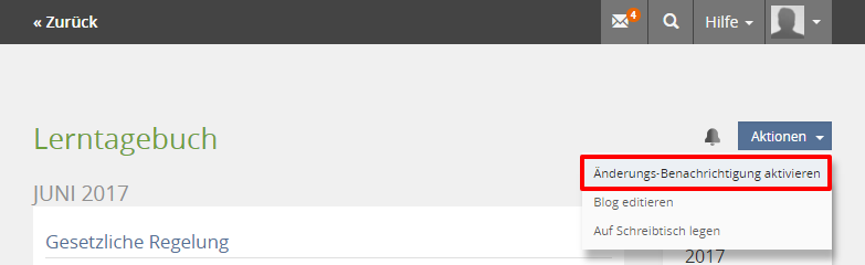 Um bei Änderungen benachrichtigt zu werden, öffnen Sie das Menü "Aktionen" in der Titelleiste des Blogs und wählen Sie "Änderungs-Benachrichtigung aktivieren" aus. Dass die Änderungs-Benachrichtigungen aktiviert sind, erkennen Sie daran, dass das Glocken-Symbol nun gelb statt grau ist.