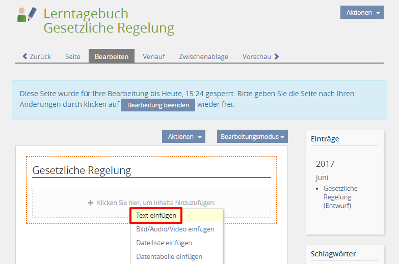 ILIAS öffnet den Seiteneditor, in dem Sie den Eintrag bearbeiten können.