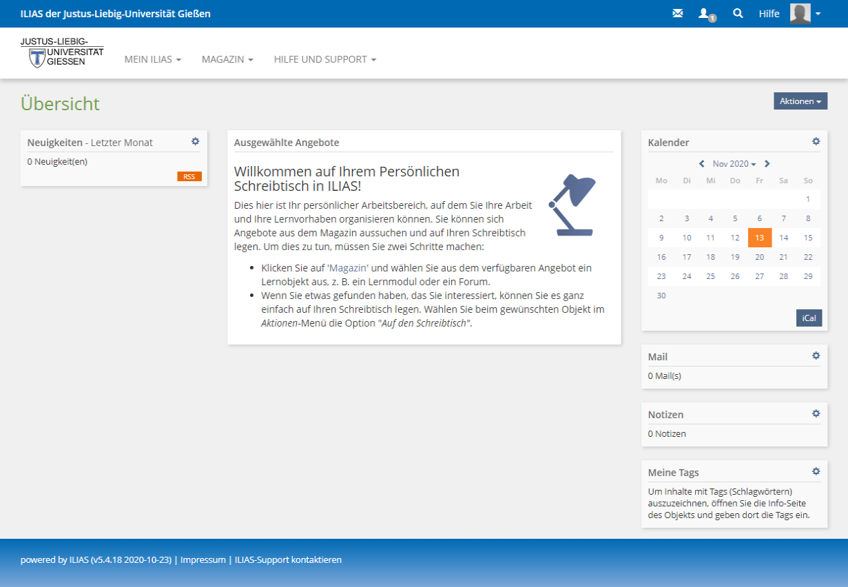 KontakteSucheHilfeProfilHilfe und SupportMagazinMein ILIASNeuigkeitenAusgewählte AngeboteKalenderMailNotizenMeine TagsMenü - Persönlicher SchreibtischMenü - MagazinMenü - HilfeNachrichtenKalenderMailNotizenAktive BenutzerMeine BookmarksAusgewählte Angebote