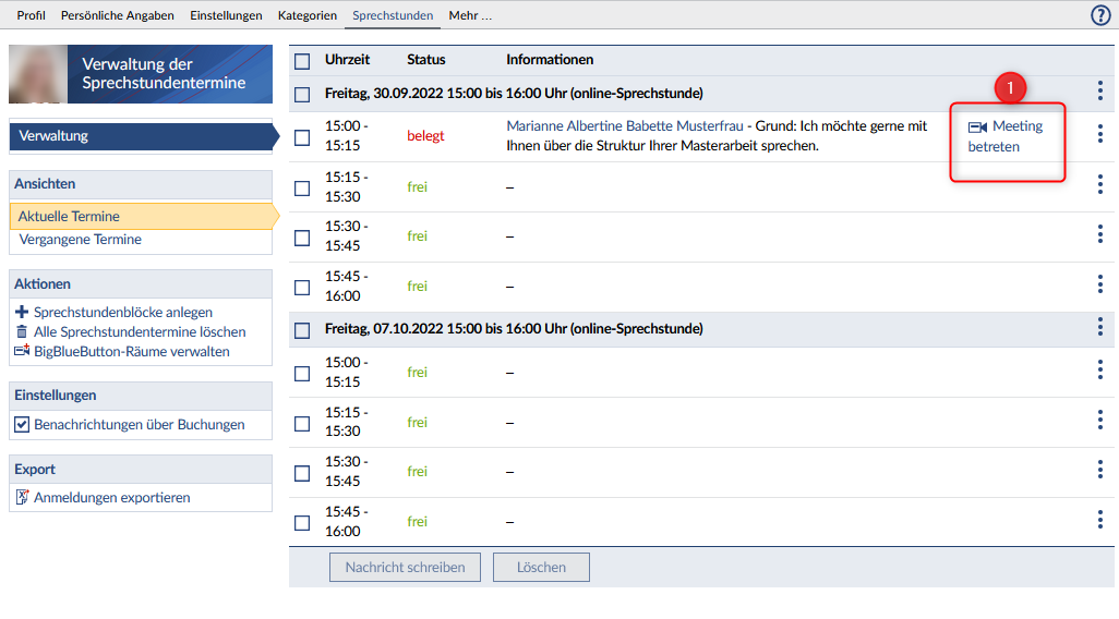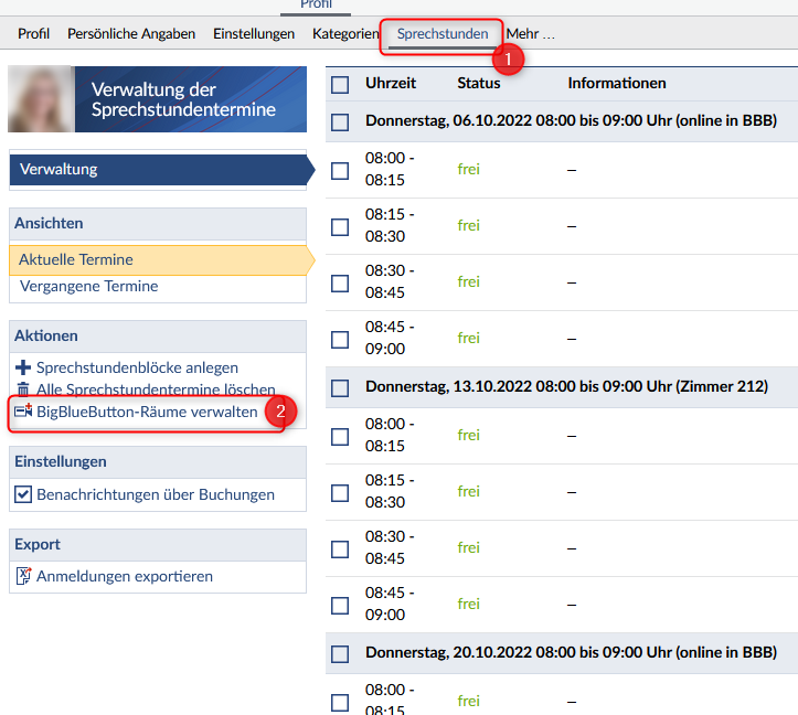 Webkonferenz-Raum für Sprechstunden verwalten
