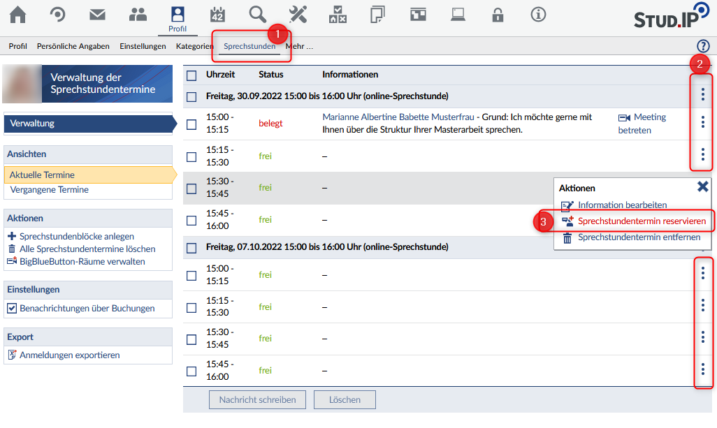 Die eingetragenen Teilnehmer:innen bekommen von Stud.IP eine E-Mail mit der Einladung zu der Sprechstunde!