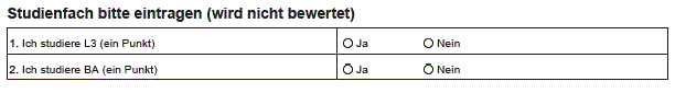 Hinter diesen Feldern stecken natürlich echte Fragen, welche auch mit Punkten versehen sein müssen, damit in der Ergebnistabelle auch etwas vorzufinden ist. Diese Fragen sollten zu beginn an fester Position stehen. Ein "Ja" ist z.B. dann einen Punkt wert, der ganz am Ende natürlich wieder abgezogen werden muss.