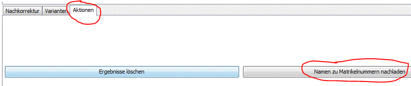 Klaus bietet einige nützliche Funktionen und pdf-Exporte, welche die Klausureinsicht unterstützt. Bevor Sie sich jedoch an diese Ausgaben machen, sollten Sie diese im Vorfeld optimieren: Namen, ID und Matrikelnummern sollten i.d.R. erkennbar sein. Die Namen müssen Sie dazu vorab nachladen, i.d.R. machen Sie das über die Perspektive "Ergebnistabelle", Register "Aktionen", "Namen zu Matrikelnummern nachladen":