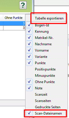Anschließend klappt eine Liste auf, in der Sie für den Tabellenexport wichtige Felder nachträglich auswählen können (siehe Abbildung). Insbesondere die "Scan-Dateinamen" dürfen Sie nicht vergessen. Anschließend exportieren Sie die Tabelle über den obersten Eintrag in der gleichen Liste.