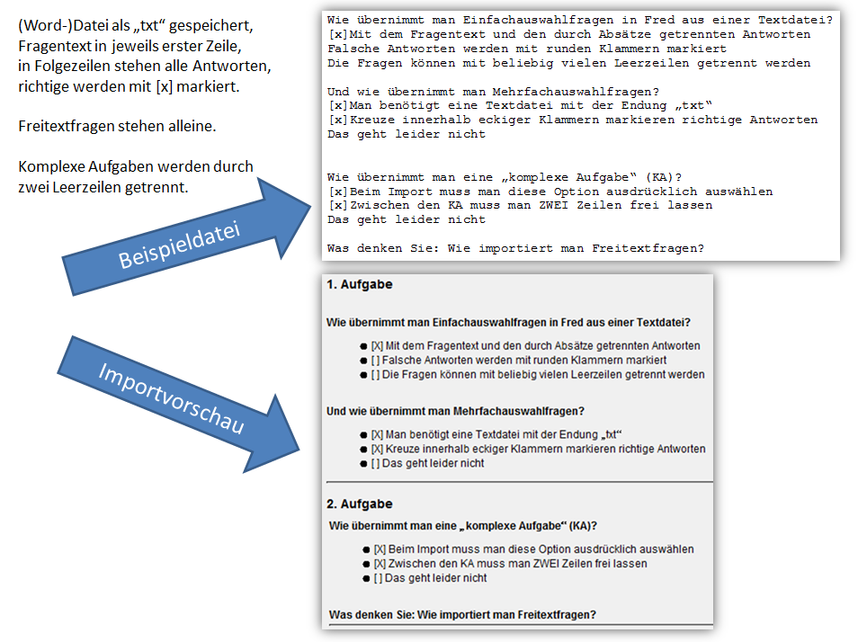 Mehrere Fragen werden mit Leerzeilen getrennt. Der Fragentext steht dabei in der ersten Zeile der Frage, es folgen in den weiteren Zeilen die Antworten. Falsche bleiben ohne Markierung, richtige erhalten ein Kreuz in eckigen Klammern.
