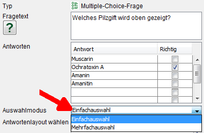 Single-Choice-Fragen sollten als solche auch erkennbar sein, sonst erzeugen Sie bei den Prüflingen unnötige kognitive Dissonanzen und senken damit die Qualität Ihrer Prüfung. Wählen Sie dazu "Einfachauswahl" anstelle der Einstellung "Mehrfachauswahl" aus.