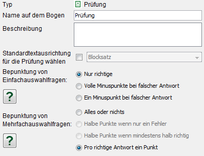 Wenn Sie mit der Mehrfachauswahl (Multiple-Choice) arbeiten, machen Sie sich bitte bewußt, dass die Prüflinge bei jeder Antwortalternative entscheiden müssen, ob diese richtig oder falsch ist. Ein Kreuz an der richtigen Stelle hat daher den gleichen Wert wie ein nicht gesetztes Kreuz bei einer falschen Antwortalternative! Klaus ist hier ganz streng und erlaubt keine intuitive (aber eigentlich falsche) Punktevergabe nur für korrekte angekreuzte Antworten. Bei der Bewertungsoption "Pro richtige Antwort ein Punkt" (s.u.) muss die Gesamtpunktzahl daher also der Anzahl der Wahlmöglichkeiten entsprechen.