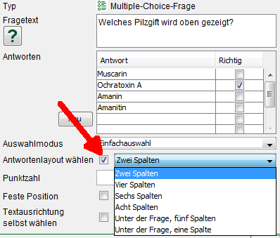 Klaus kann Fragen und Antworten in verschiedenen Layouts darstellen. Das automatisch verwendete Layout ist für viele Fragen nicht passend, da z.B. Fragen- und Antwortlängen stark variieren können. Aus diesem Grunde sieht Klaus die Anpassungsmöglichkeit des Layouts für jede einzelne Frage vor. Probieren Sie ein wenig die verschiedenen Einstellungen aus, bis Sie das für die Frage angemessene Layout gefunden haben. Der Aufwand lohnt meist: Neben der besseren Übersichtlichkeit können Sie oft sogar die Seitenzahl der Klausur verringern.