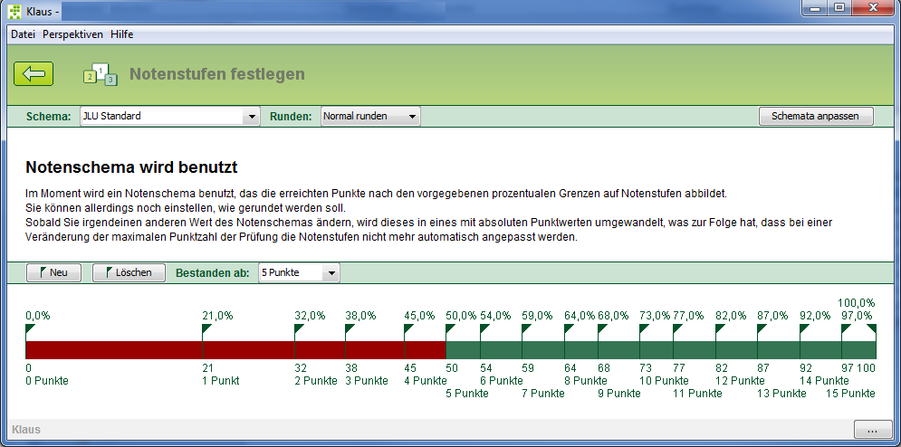 Es steht Ihnen dann auch in anderen Klausuren zur Verfügung, da es nicht in der .klaus-Datei, sondern übergeordnet auf Ihrem Computer gespeichert wird. Im Beispiel haben wir das Schema übrigens einfach "JLU Standard" genannt: