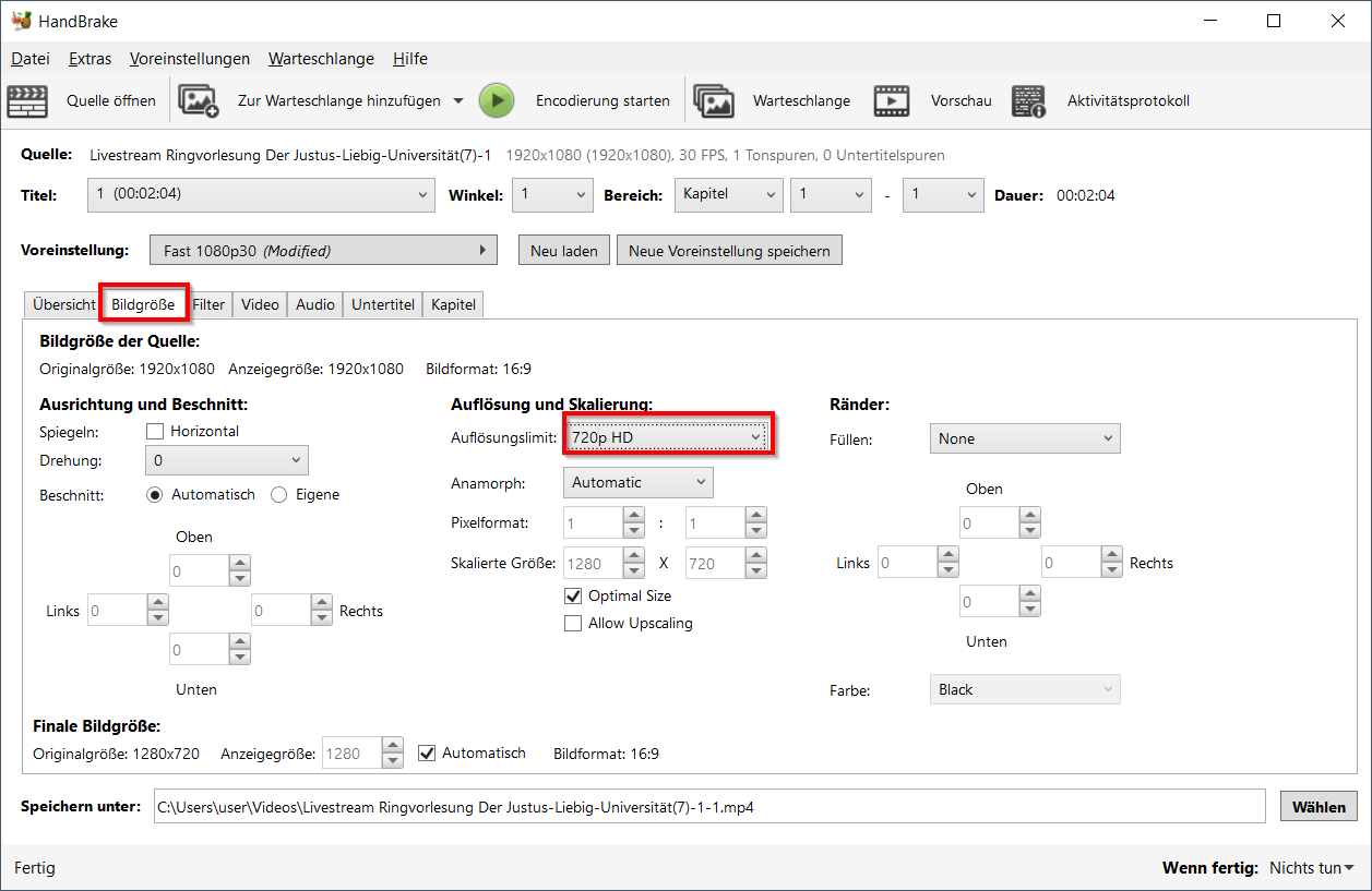 Reiter Bildgröße. Breite und Höhe des Videos angeben über das Auswahlfeld "Auflösungslimit"