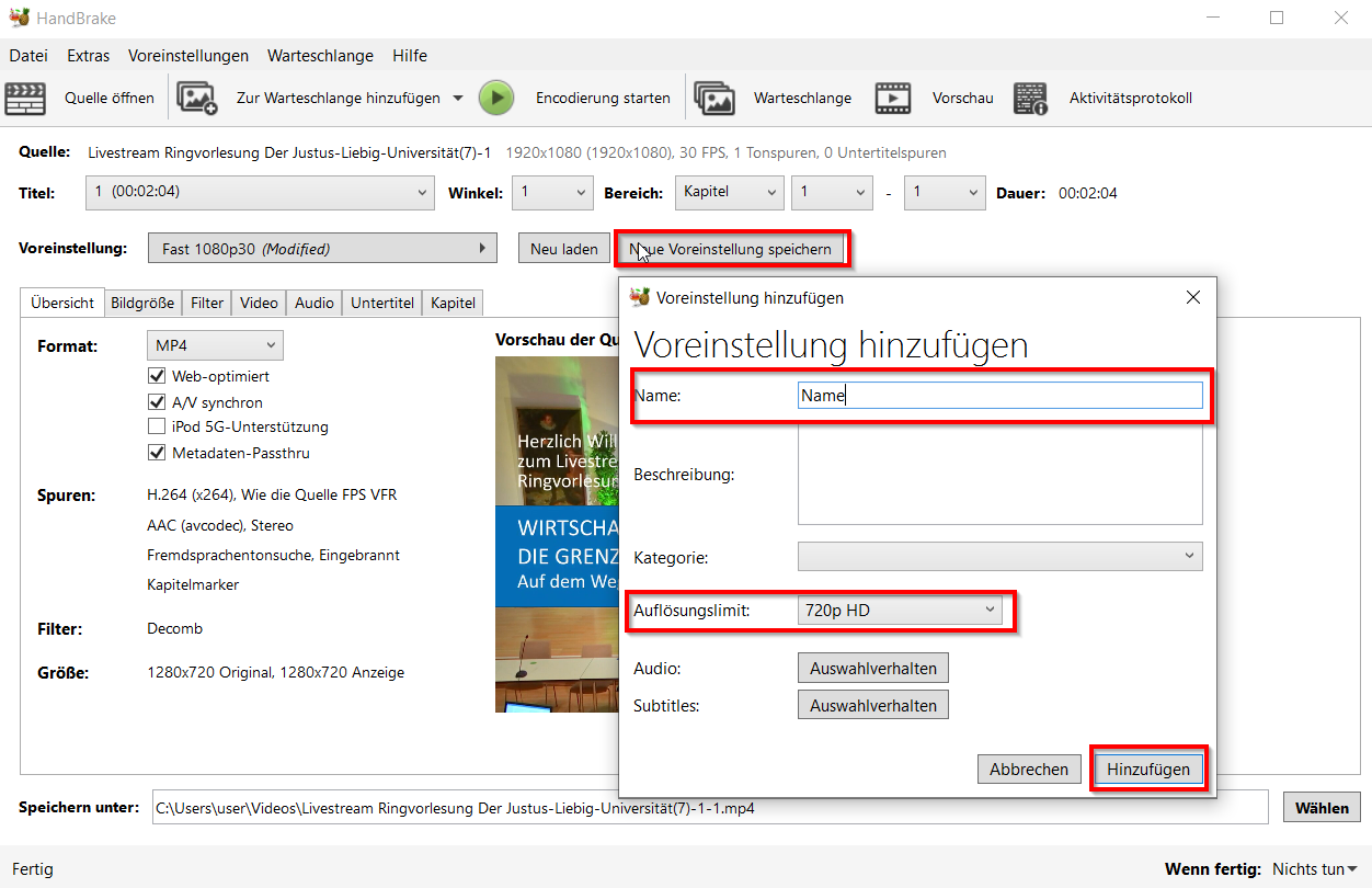 Die Einstellungen können für später gespeichert werden (Neue Voreinstllung speichern).