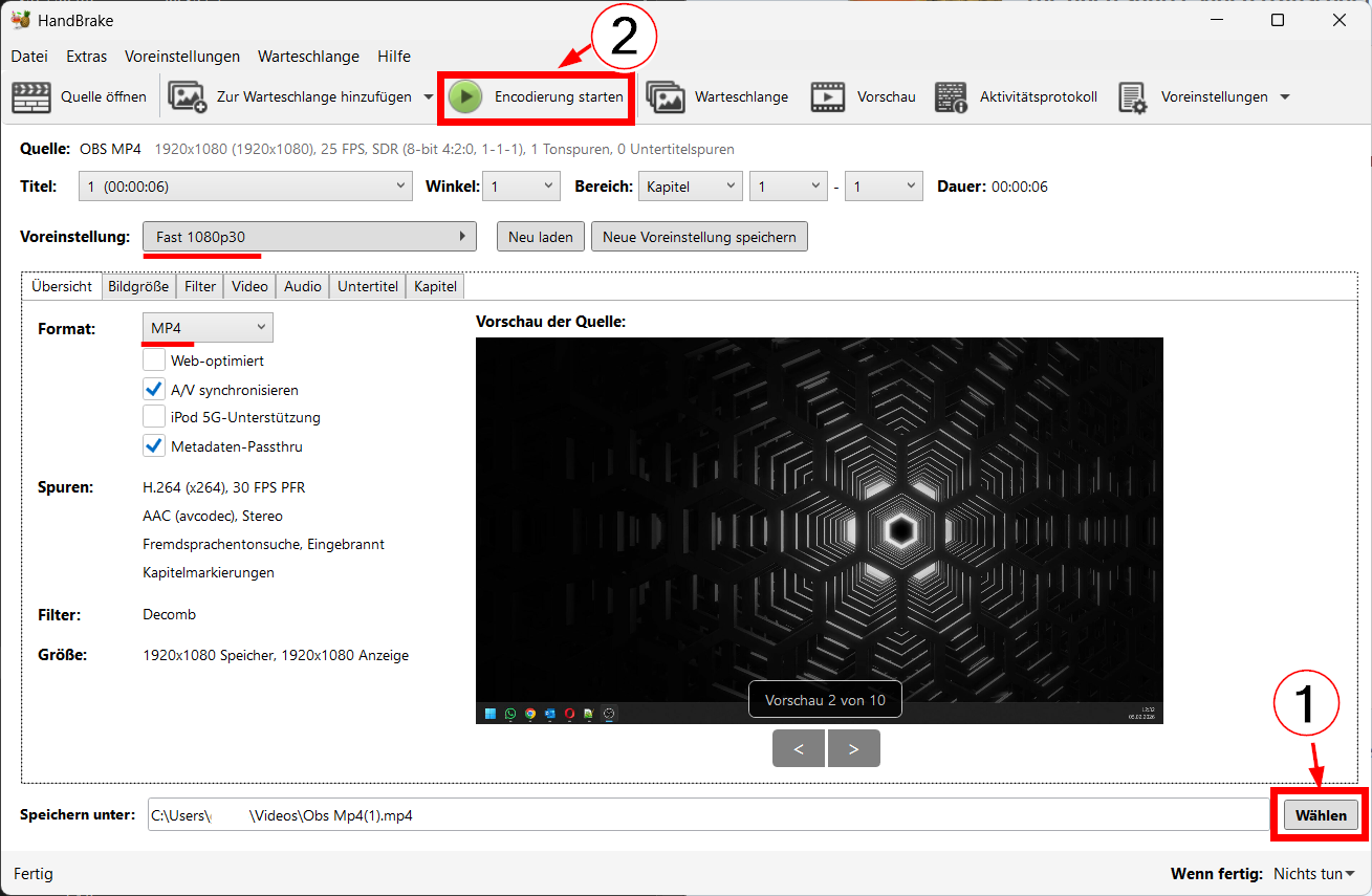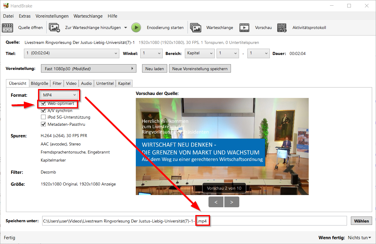 Reiter Übersicht. Als Format mp4 auswählen. "Web-optimiert" aktivieren