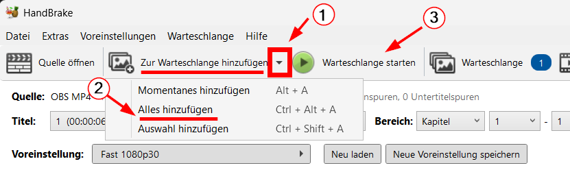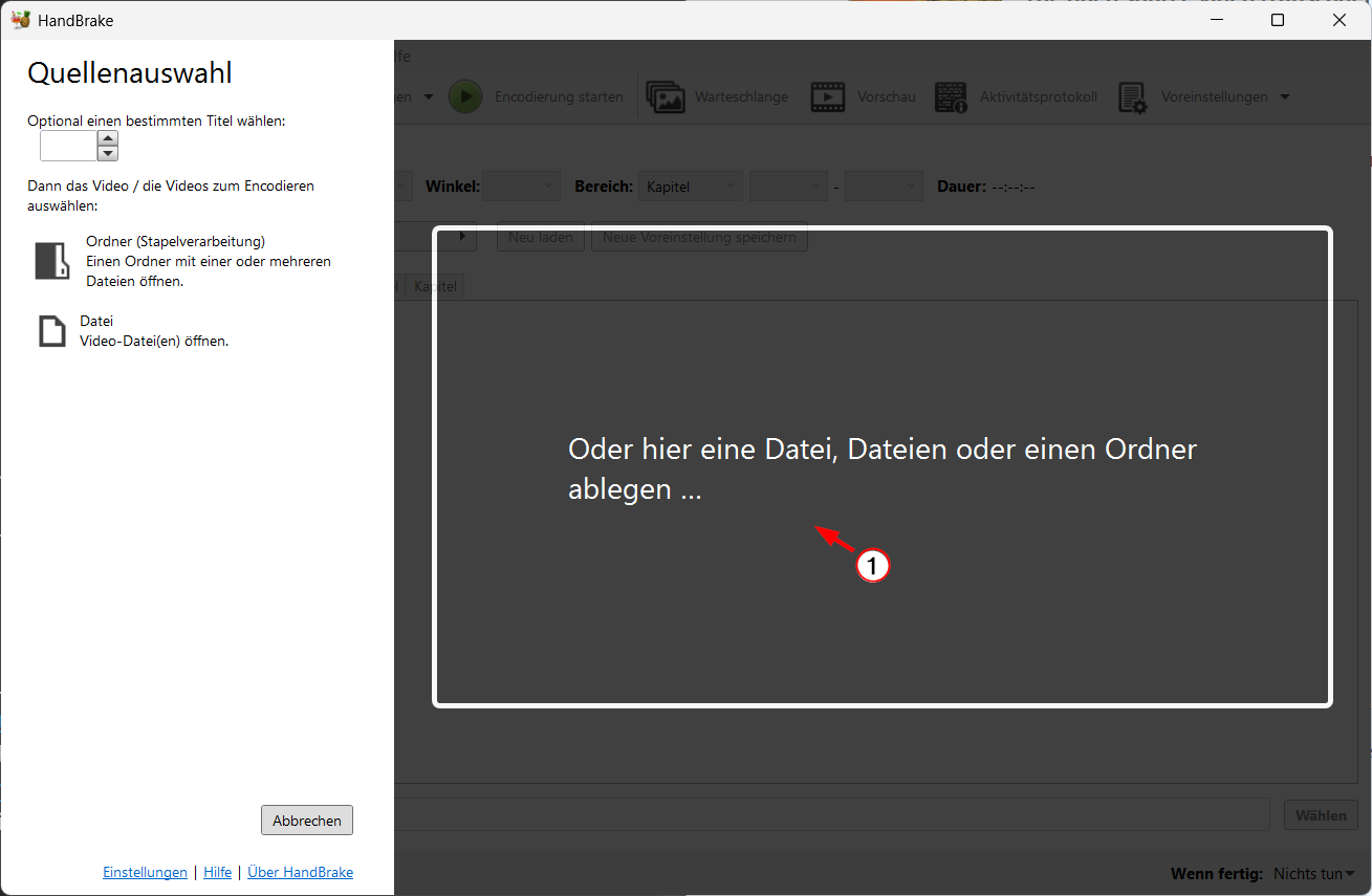 Handbrake starten und ein Video auswählen (oder ein Video mit der Maus direkt in Handbrake ziehen)
