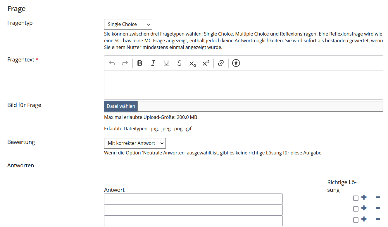 Um die Zuschauerinnen und Zuschauer des Videos aus der passiven Zuschauerrolle zu holen und in eine aktive Lernerrolle zu bringen, können Sie im interaktiven Video an bestimmten Stellen Fragen stellen, die beim Abspielen des Videos aufploppen und das Abspielen unterbrechen. Auf diese Weise können Sie die Aufmerksamkeit der Lernenden steuern, Vorwissen aktivieren, mit Wissensfragen den Lernstand abfragen oder Reflexionsfragen einbauen. Gehen Sie hierzu auf den Reiter "Fragen, Kapitel und Kommentare" und klicken dort auf den Button "Frage einfügen". Je nachdem, für welchen Fragentyp Sie sich entscheiden, können Sie verschiedene Einstellungen auswählen (z.B. Feedback bei richtiger oder falscher Antwort). Beim Abspielen des Videos stoppt das Video dann an der Stelle, an der Sie die Frage platziert haben (über eine Zeitangabe) und die Lernenden müssen die Frage beantworten, um das Video fortsetzen zu können.