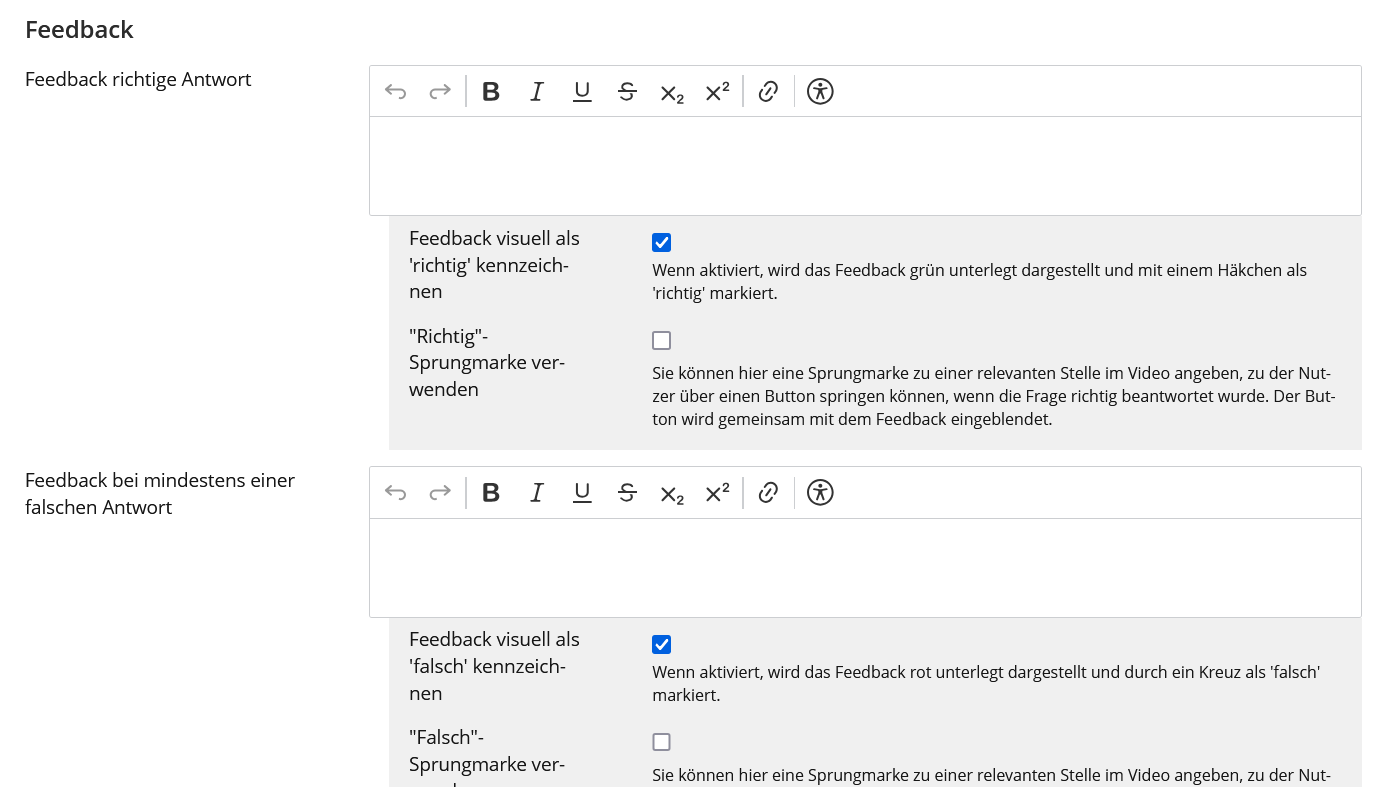 Lehrende können Feedback für richtige und falsche Antworten hinzufügen, einschließlich eines Sprungmarkers innerhalb des Videos, um auf den für die Fragestellung relevanten Teil des Videos zu verweisen. Die Antworten und Ergebnisse der Studierenden können online angezeigt oder als CSV-Datei exportiert werden.