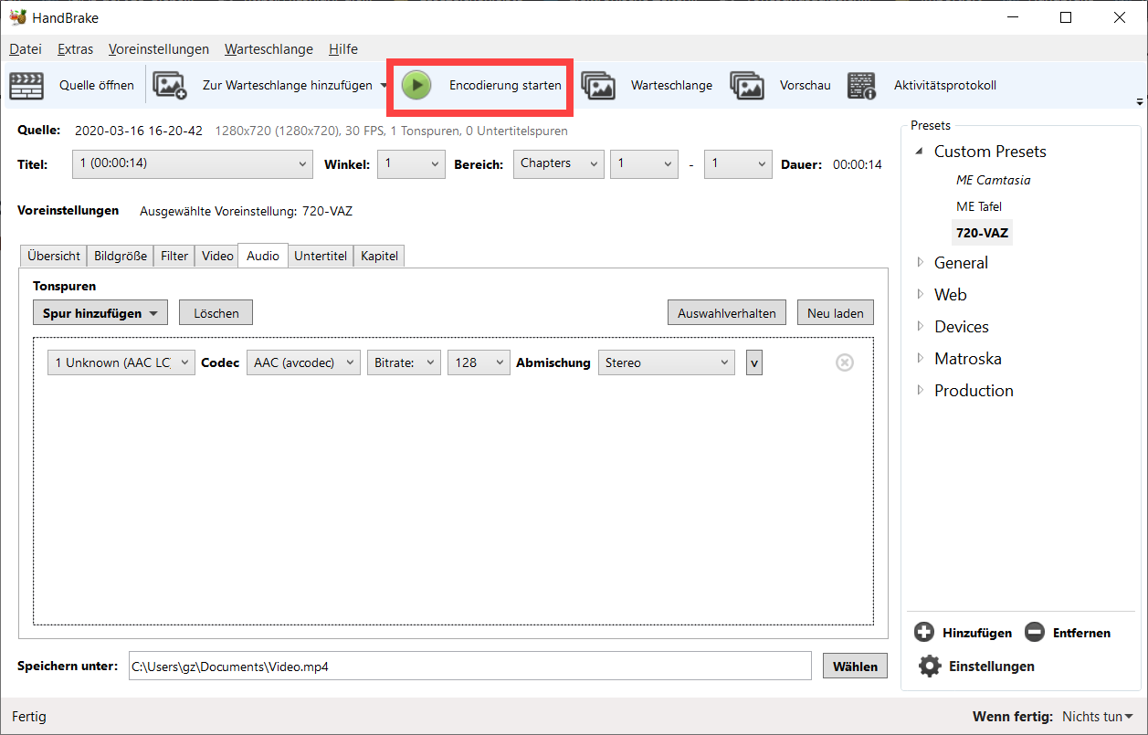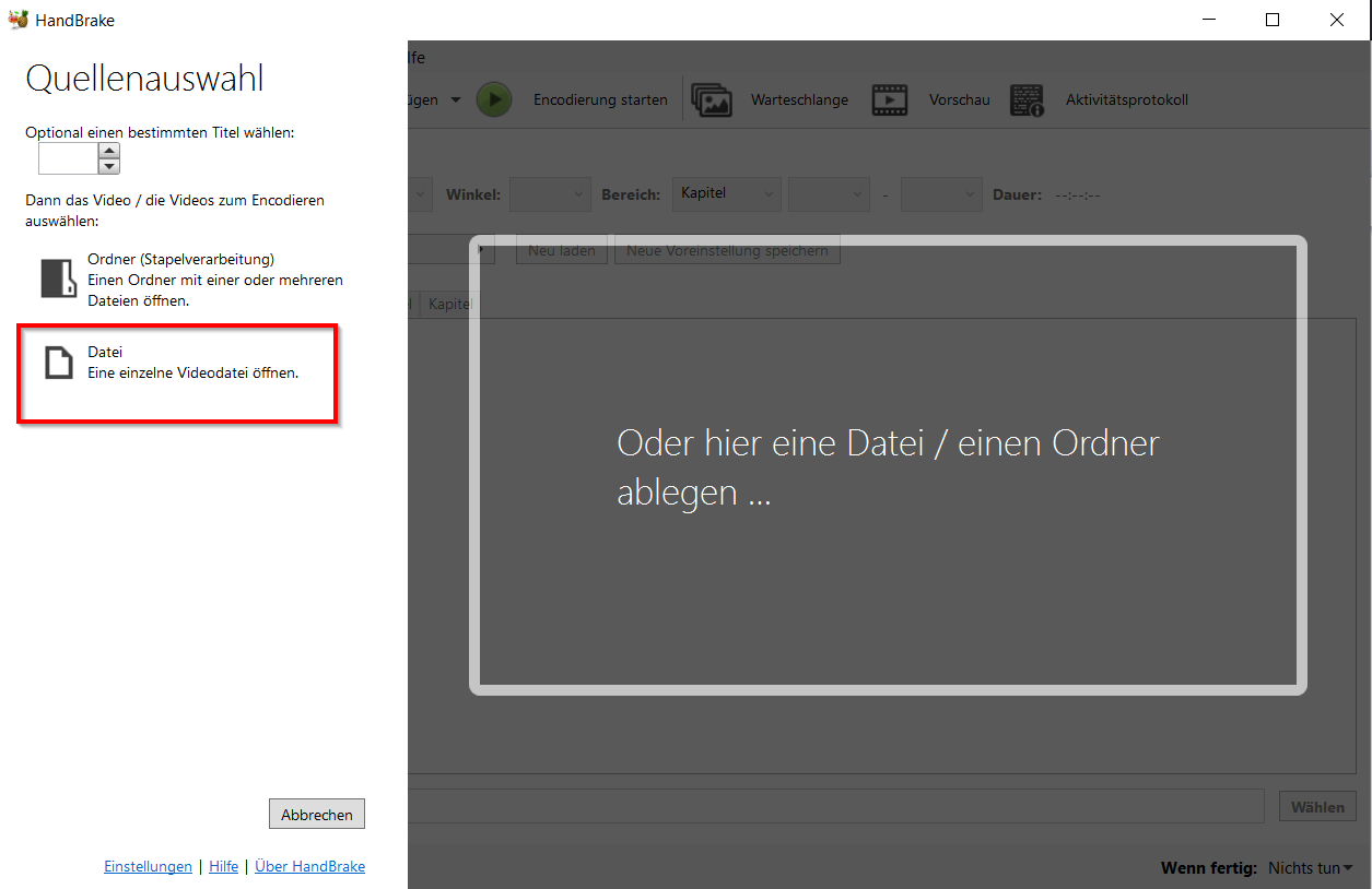 Handbrake starten und ein Video auswählen (oder ein Video mit der Maus direkt in Handbrake ziehen)