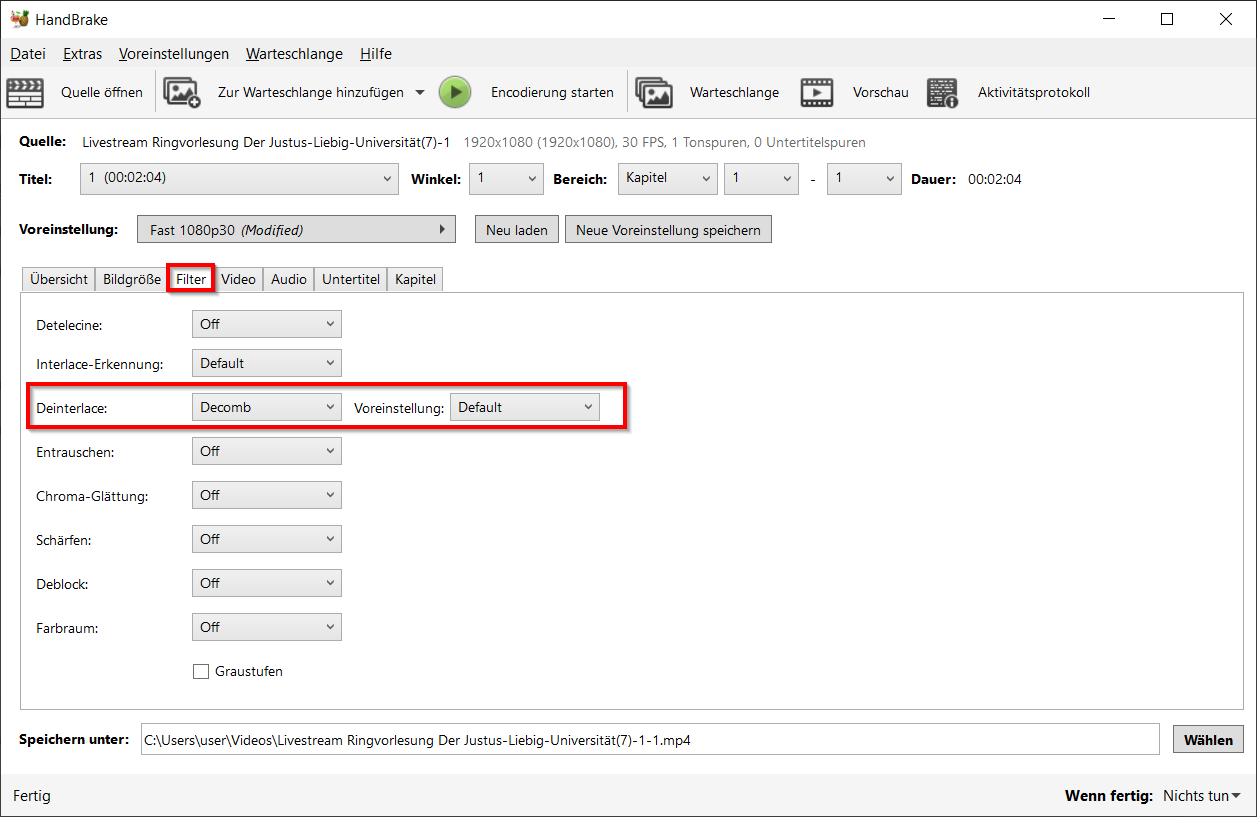 Reiter Übersicht. Als Format mp4 auswählen. "Web-optimiert" aktivieren