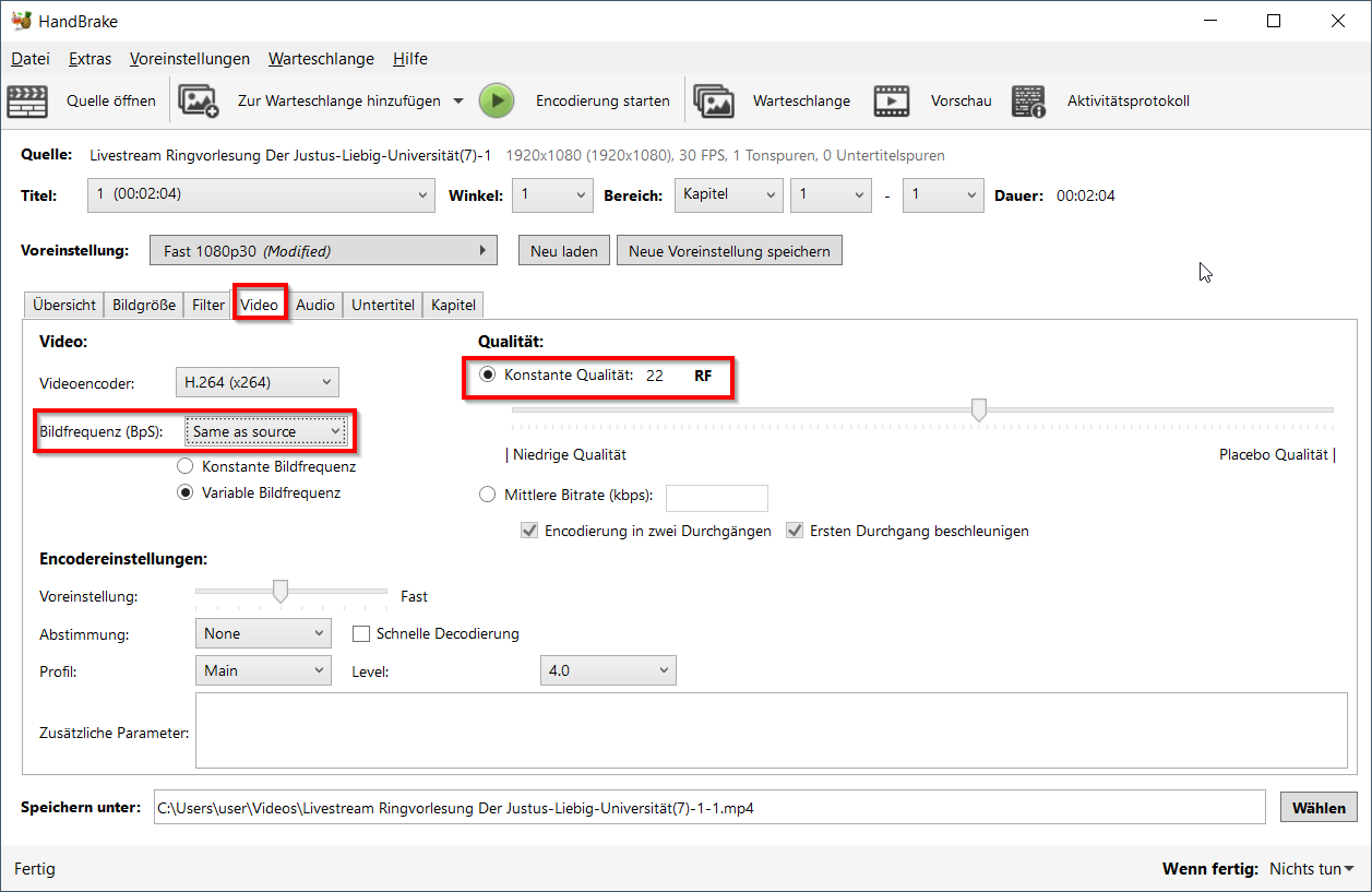 Reiter VideoBildfrequenz Same as Source, variable Bildqualität. Qualität 22.