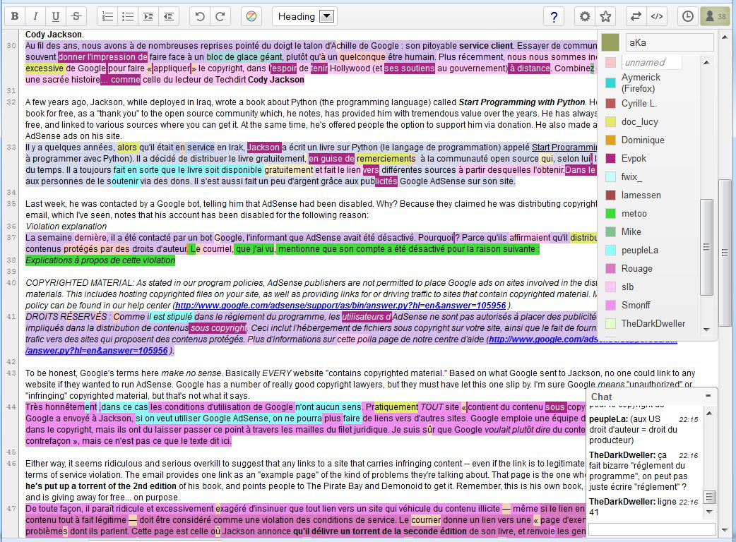 Das Etherpad ermöglicht Studierenden und Lehrenden, gleichzeitig an einem gemeinsamen Text zu arbeiten. Dabei sind alle Änderungen sofort für alle Schreibenden sichtbar. Indem jedem Schreibenden eine bestimmte Farbe zugeordnet wird, ist auch die Autorenschaft der einzelnen Passagen deutlich erkennbar. Über die „Änderungshistorie“ ist es möglich, alle Änderungen bzw. Weiterentwicklungen des Textes nachzuvollziehen – und gegebenenfalls ältere Versionen wiederherzustellen. Über einen integrierten Chat können sich die Teilnehmenden darüber hinaus parallel zur kollaborativen Textarbeit austauschen – und beispielsweise darüber diskutieren, ob alle mit dem aktuellen Text einverstanden sind oder ob bestimmte Änderungen wieder rückgängig gemacht werden sollen. Das Etherpad eignet sich damit hervorragend, um kollaborativ Texte zu schreiben oder zu überarbeiten.