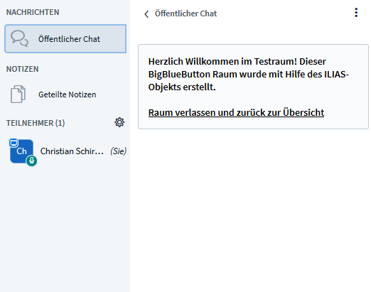 - Wurde in ILIAS ein BigBlueButton-Raum angelegt, kann dieser nur mit Klarnamen betreten werden. Eine Änderung des Namens, mit dem beigetreten wird, ist nicht möglich.