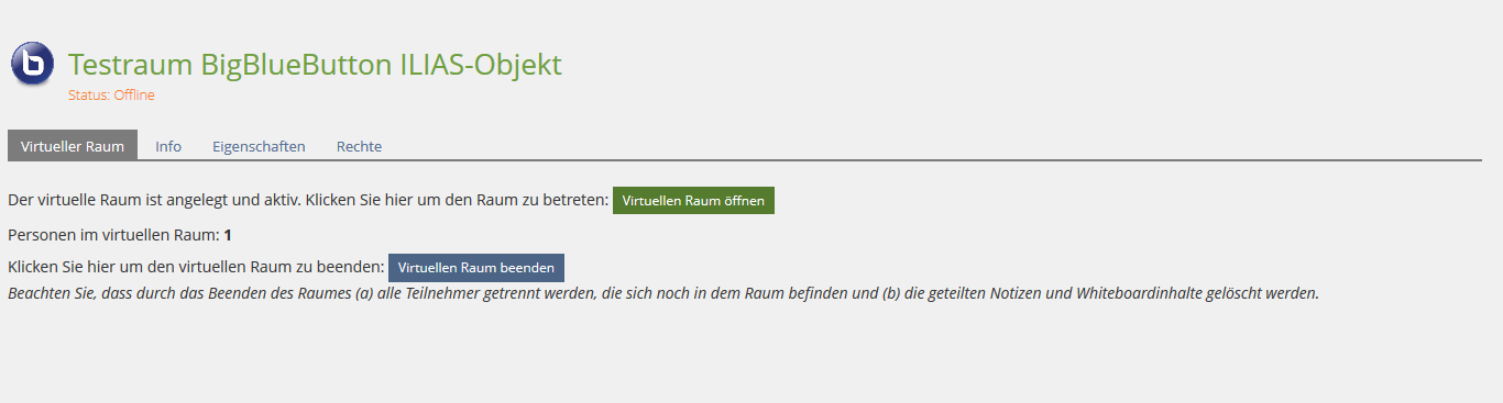 - Die Räume, welche Sie mit Hilfe des BigBlueButton Plug-Ins in ILIAS angelegt haben, können nur von Kursadministrator/-innen in ILIAS geöffnet werden. Erst nachdem die Räume von den Administrator/-innen gestartet wurden, können Kursteilnehmer/-innen beitreten. Öffnen Sie Räume Ihrer Veranstaltungen daher früh genug, um gegebenenfalls Verwirrung bei den Teilehmenden zu vermeiden.