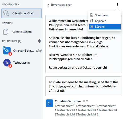 Unerwünschte Chat Beiträge können von Ihnen gelöscht werden. Beachten Sie aber, dass dies nur möglich ist, wenn Sie den gesamten öffentlichen Chat löschen.