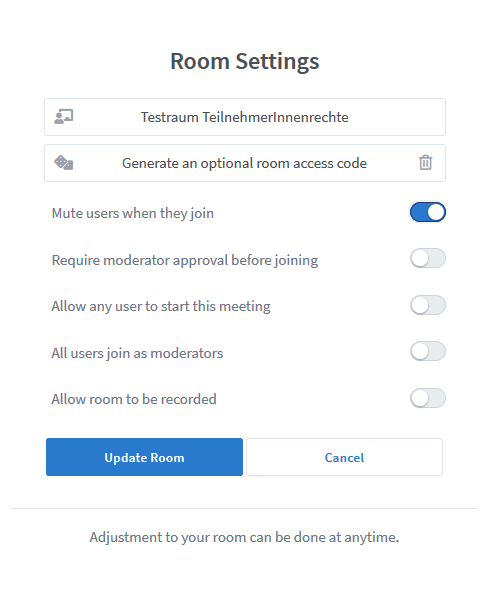 Weiterhin gilt, dass Vorab-Einstellungen von Räumen dergestalt getroffen werden sollten, dass Teilnehmende stummgeschaltet und nicht als Moderierende Ihrem BigBlueButton-Raum beitreten sollten. Abhängig von ihrer Veranstaltung sollten Sie auch die übrigen Optionen beachten, welche Ihnen bei der Einrichtung eines Raumes angeboten werden.