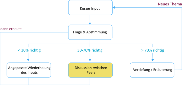 Das „Peer Instruction“ Konzept wurde von Eric Mazur (Professor der Universität Harvard) Anfang der 90er Jahre entwickelt. Die theoretische Wissensvermittlung findet zuhause statt, Studierende bereiten Text vor und setzen diesen in der Veranstaltung mit praktischen Beobachtungen in Beziehung. Dabei kommt auch ein Abstimmungssystem zum Einsatz.